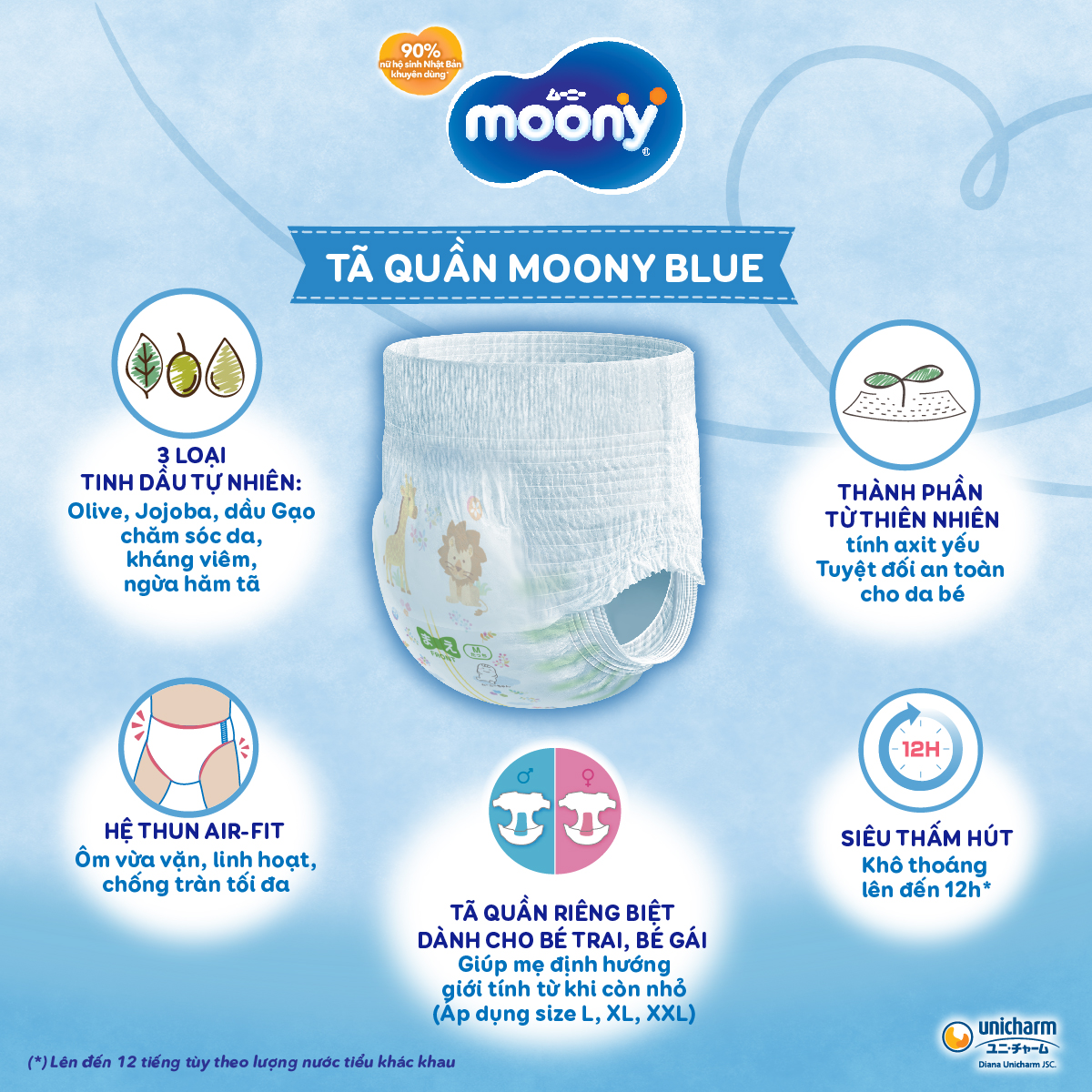 Tã quần Moony các size L, XL mang thiết kế dành riêng cho bé trai và bé gái giúp mẹ định hướng và giáo dục giới tính cho bé từ khi còn nhỏ.